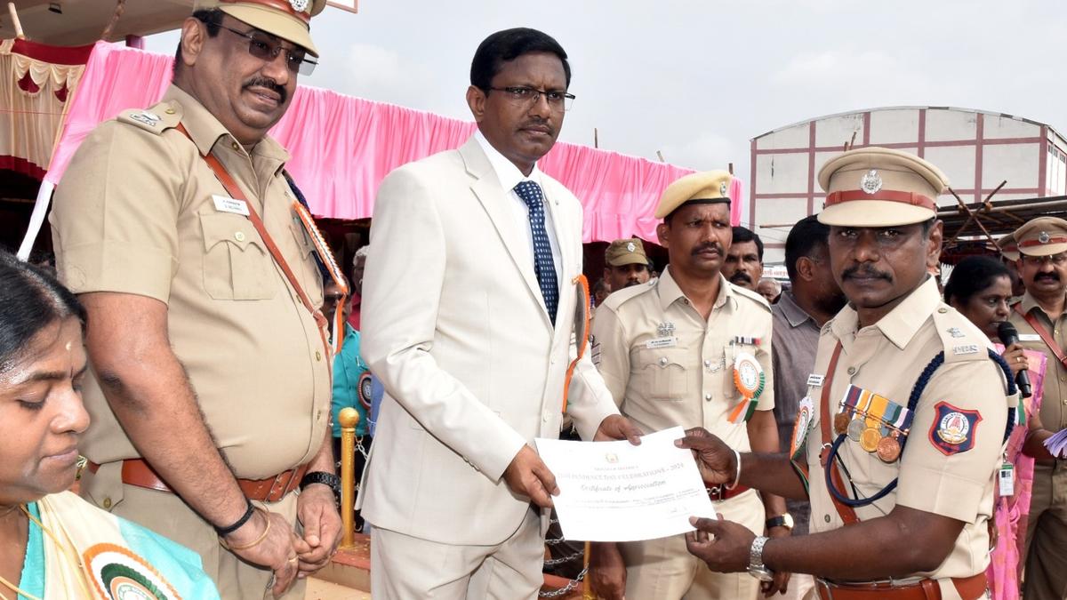 Collector P. Rathinasamy presenting a certificate of appreciation to a policeman during the Independence Day celebrations held in Ariyalur on Thursday.