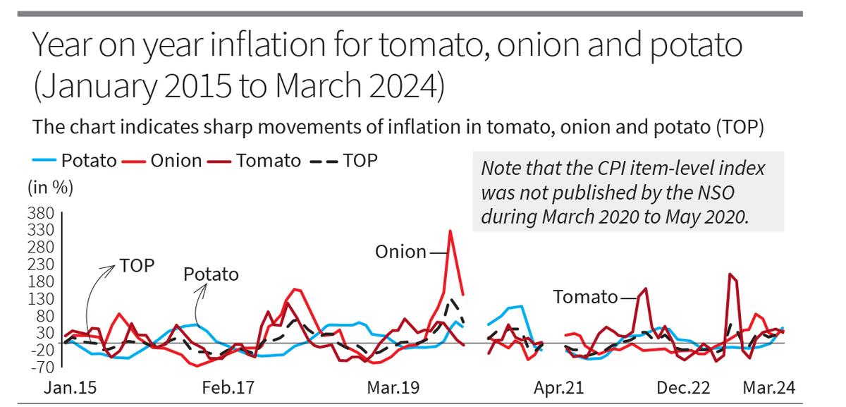 The volatility and importance of TOP in shaping inflation trends highlight the need for effective policy interventions and a nuanced understanding of agricultural supply chains. These are perishable crops and are subject to a number of biotic and abiotic stresses. As these crops do not have Minimum Support Price and are mostly sold to private traders by farmers, this volatility in prices also hurts farmers, the majority of whom are net buyers of these crops. The possible solutions to reduce the volatility of inflation for these crops include an overhauling of agricultural value chains and improvement in the cold storage facilities, better prices for farmers to incentivise the production of the crops, and increased profitability in the cultivation that can be achieved by reducing the exorbitantly high input prices of fertilizers and pesticides used in the production of these crops.