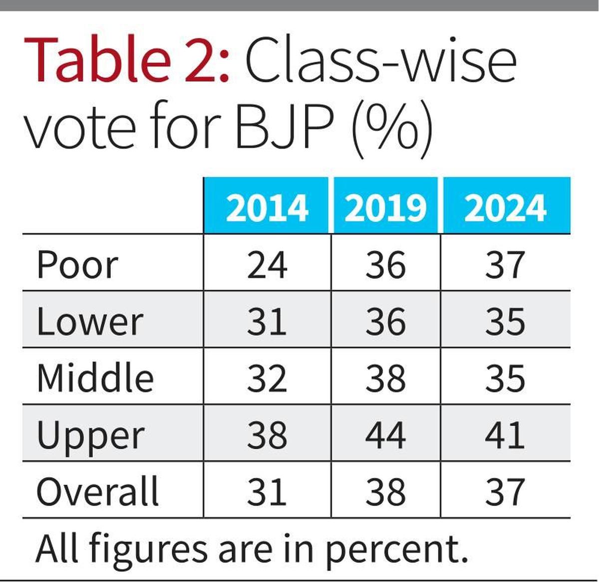 In the 2014 and 2019 Lok Sabha elections, the gap between the poor and the rich with regard to their support for the BJP was very wide — that is, more among the rich and middle class voted for the BJP compared to the those belonging to the poor and lower class. But in 2024, this gap has narrowed significantly. This is mainly because of the steady rise in the vote of the poor in favour of BJP.