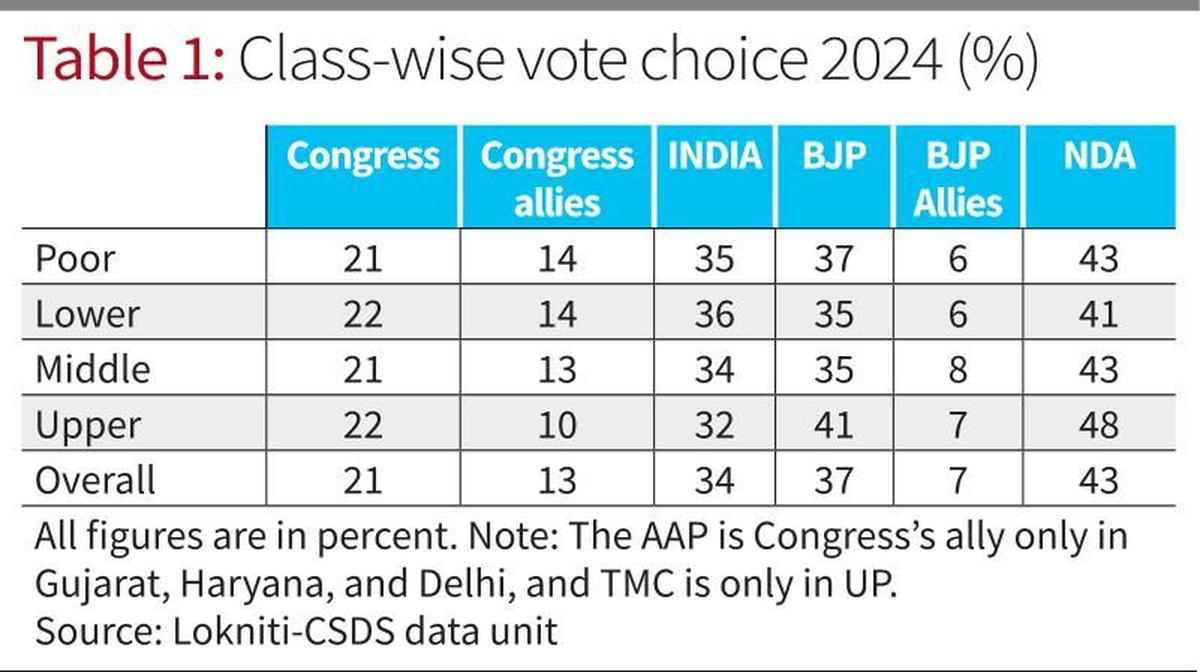 This data means that the Congress has not acquired additional support in spite of its specific appeal to the economically lower strata of society. There is a flatness to support for the Congress across economic classes.