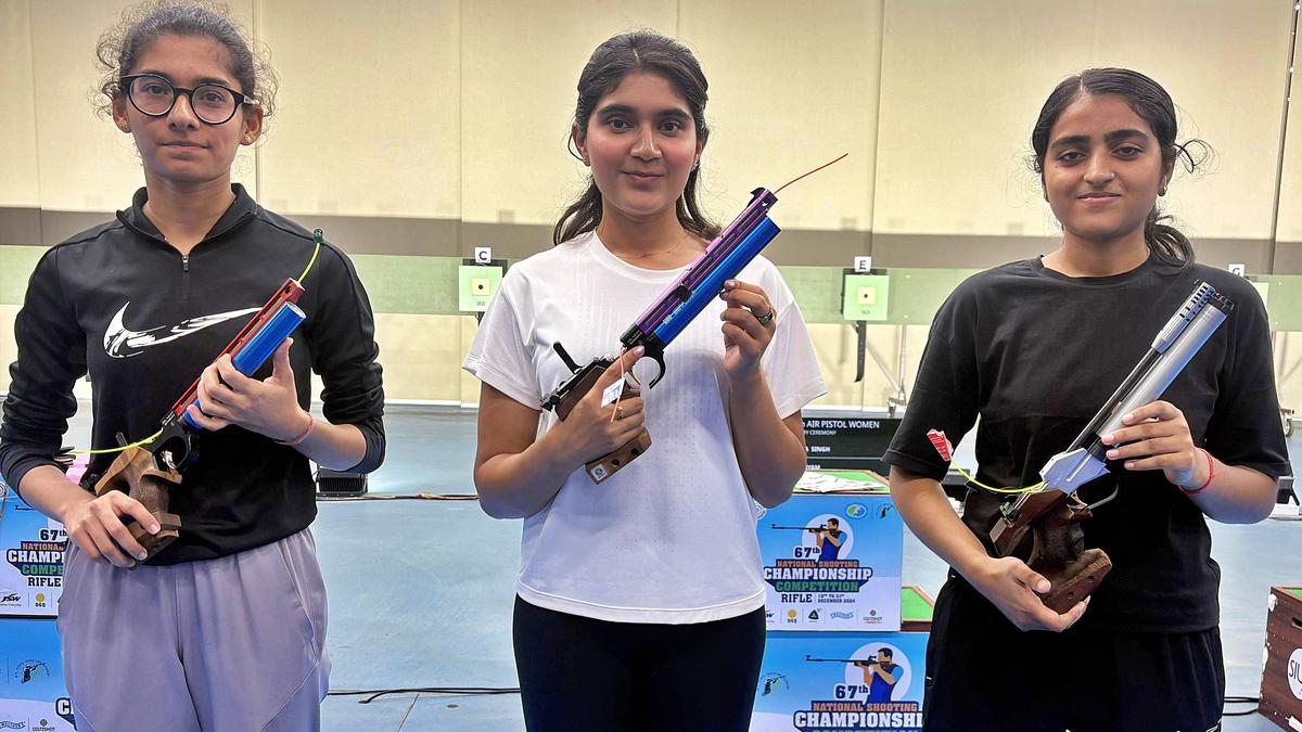 Sainyam, Esha Singh and Anjali Shekhawat, the top three in the air pistol event in the National shooting selection trials in Bhopal.