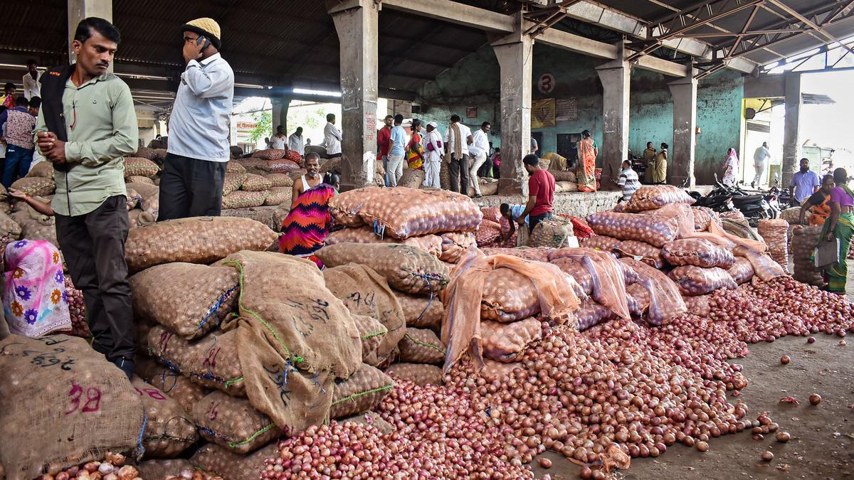 Workers sort onions at the APMC Market in Solapur, Maharashtra