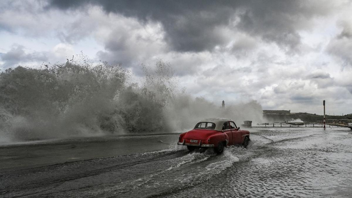Young people look at waves crashing against the Malecon promenade in Havana due to the passage of Hurricane Milton on October 9, 2024.