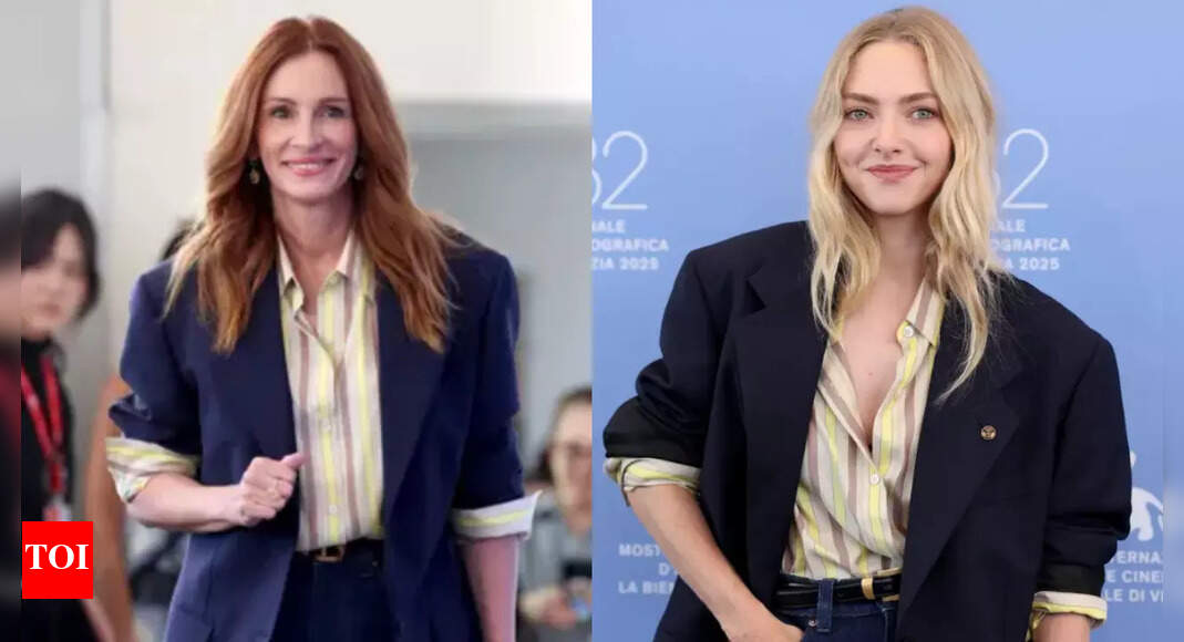 Cue Amanda Seyfried. After seeing her friend’s pictures on stylist Elizabeth Stewart’s Instagram, the Mean Girls and Mamma Mia! star sent a simple but iconic request: “Please let me wear the same outfit.” Stewart, Versace, and Julia all said yes. And just like that, Amanda landed in Venice ahead of the premiere of The Testament of Ann Lee and stepped out on September 1 in the exact same look, right down to the belt. Amanda gave it her own spin with black strappy heels, peachy-toned makeup, and her blonde hair in soft waves.The moment was instantly Instagram-worthy, not only because of the unexpected twinning but also because it championed a bigger cause, outfit repeating as a statement of sustainability. Fans were quick to cheer them on. One wrote, “This actually feels fresh, relevant and inspiring… proves different ages can wear the same look, appeals across generations, and subtly promotes a sustainable message.” Another joked, “Copy cat deluxe.”