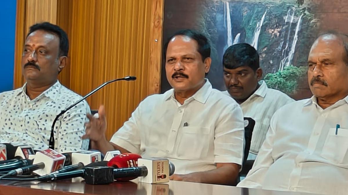 Karnataka Bhovi Development Corporation Chairperson S. Ravi Kumar (centre) addressing mediapersons in Shivamogga on September 3, 2025.