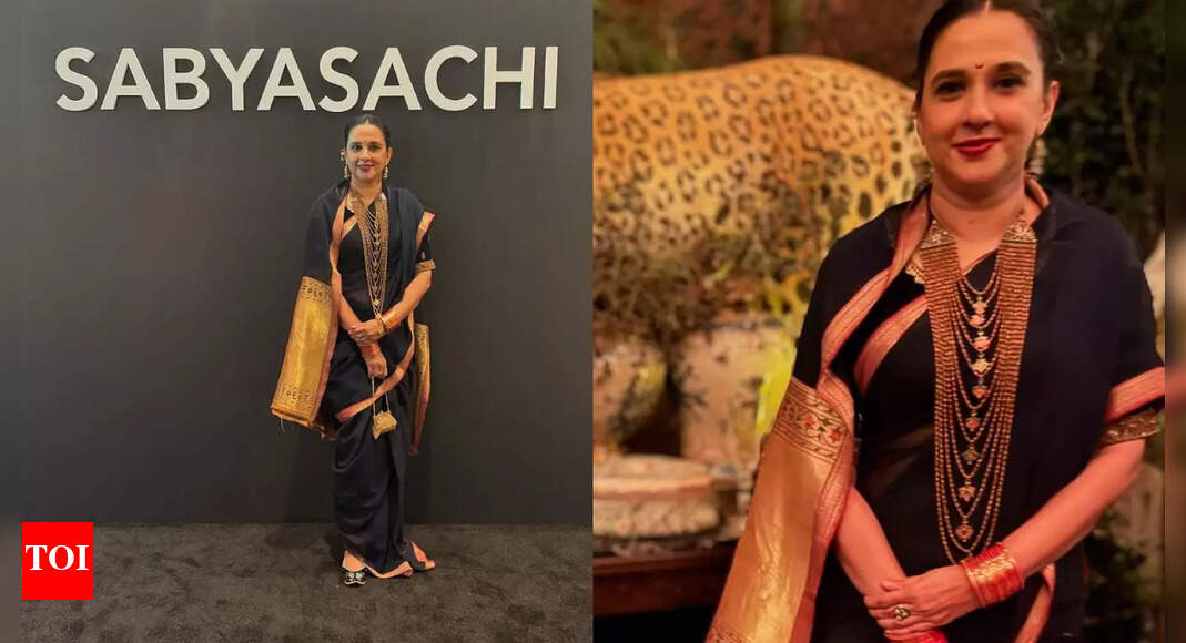 The saree’s ornate gold threadwork and delicate motifs were a nod to Baroda’s royal heritage, while its rich colour palette added a modern twist. What truly made Radhika’s look stand out, however, was how she paired the timeless sari with modern accessories. The Maharani wore a statement necklace and matching earrings, both designed with a perfect blend of traditional craftsmanship and contemporary appeal. The jewellery complemented the rich textures of the Paithani, adding layers of sophistication to her appearance.