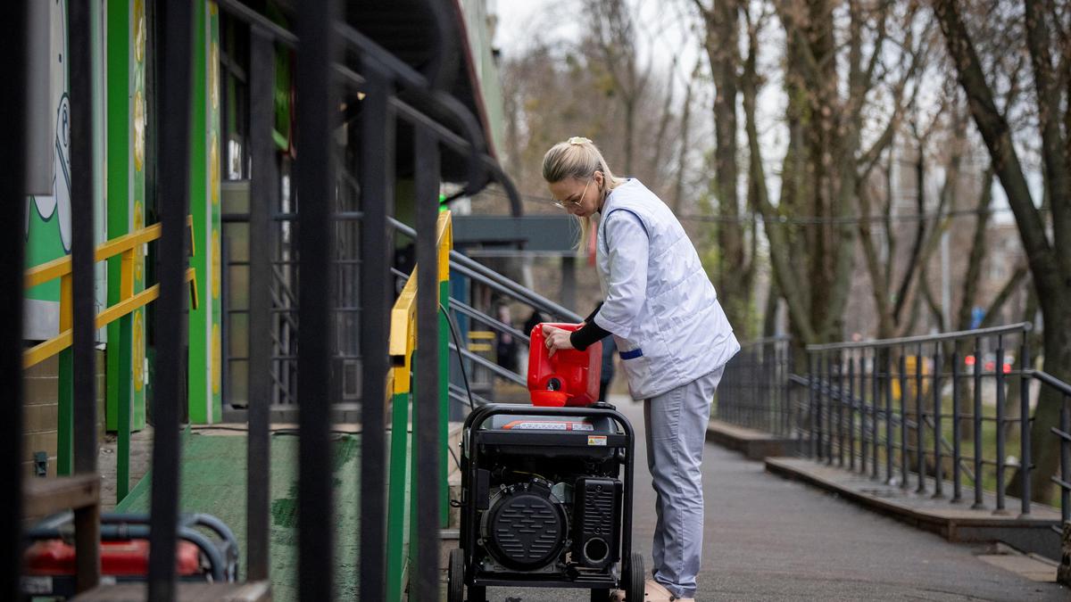 A woman fills petrol into a power generator to produce electricity for a pharmacy after critical civil infrastructure was hit by a recent Russian missile and drone attack, amid Russia’s attack on Ukraine, in Kyiv, Ukraine, December 23, 2025.