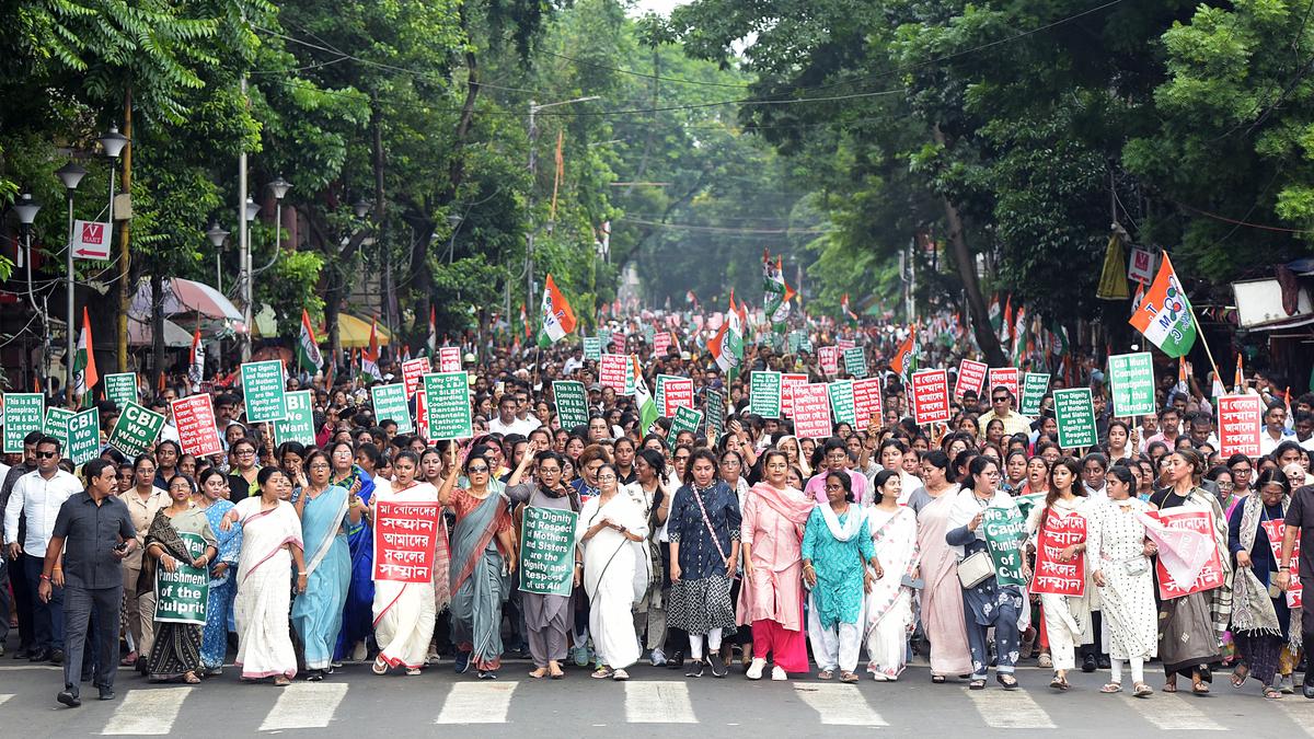 West Bengal Chief Minister Mamata Banerjee leads a rally in Kolkata on August 16, 2024 in the wake of the rape and murder of a doctor at R.G. Kar Medical College and Hospital in the city.