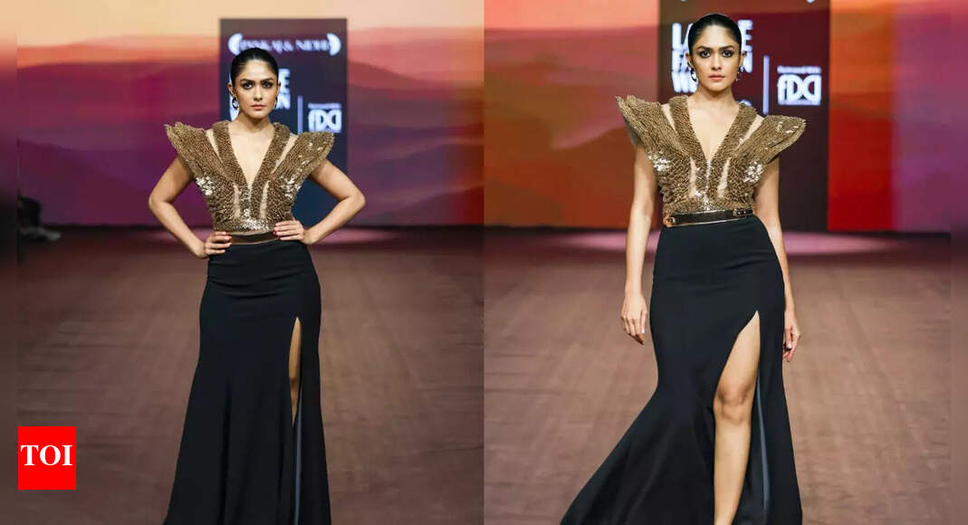 At Lakmé Fashion Week x FDCI, the runway transformed into an otherworldly empire of strength, sensuality, and futurism, thanks to the visionary design duo Pankaj & Nidhi and their latest collection, Araquis. Imagined as a realm ruled by warrior sovereigns, the collection redefined eveningwear with sculptural silhouettes, metallic accents, and commanding grace. However, the moment that truly electrified the evening came when Mrunal Thakur closed the show in a look that was nothing short of iconic.With every step, Mrunal did not just walk the ramp. She owned it. Dressed in a sculpted golden bodice that shimmered like molten armor under the lights, she embodied the spirit of Araquis – part goddess, part gladiator. The bodice featured metallic textures and architectural shoulders that radiated celestial power. Paired with a sleek black skirt and a daring thigh-high slit, the ensemble introduced fluidity and fire. It was a look that balanced strength with sensuality and beauty with boldness, and Mrunal brought it to life effortlessly.
