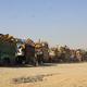 A line of cargo trucks bound for Pakistan is stranded on the Afghan side of the Torkham border crossing, which remained closed after clashes in Nangarhar province, Afghanistan, on October 14, 2025.