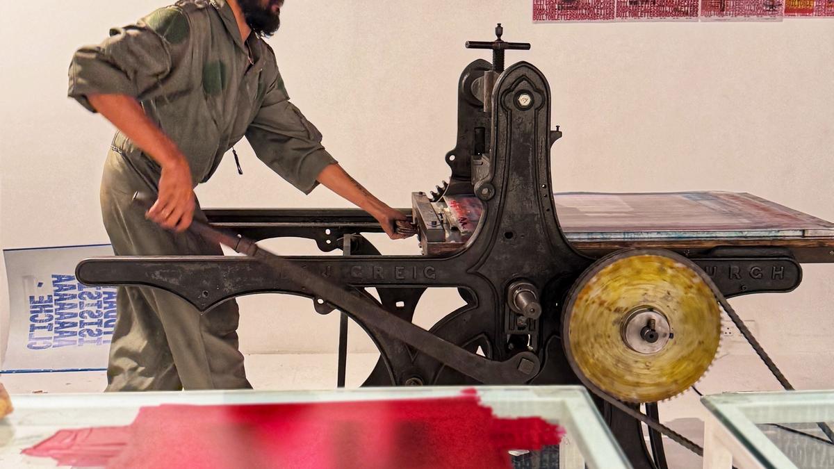 Artist Jayasimha Chandrashekar printing the phrase Every day is a cliché on the day’s newspaper on a litho press.