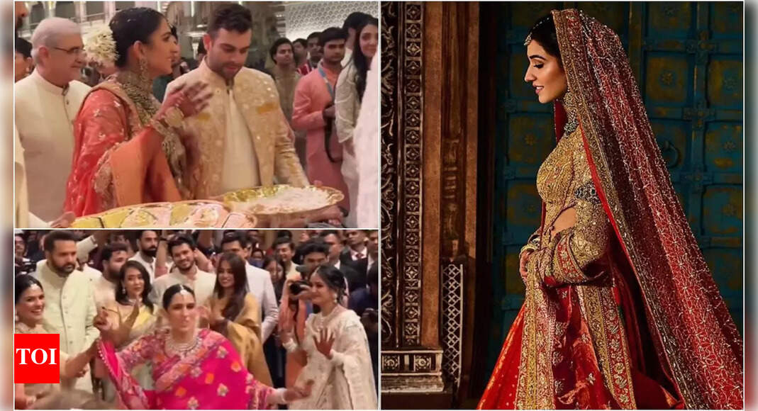 Radiant in her attire designed by Manish Malhotra, Radhika donned a sindhoori red lehenga adorned with intricate gold work and a sweeping train, exuding regal elegance. Her hair styled in a bun with a white gajra, she walked beside her husband, Anant Ambani. Shloka Mehta and Isha Ambani added to the festive atmosphere, dancing exuberantly to welcome Radhika into their esteemed family.