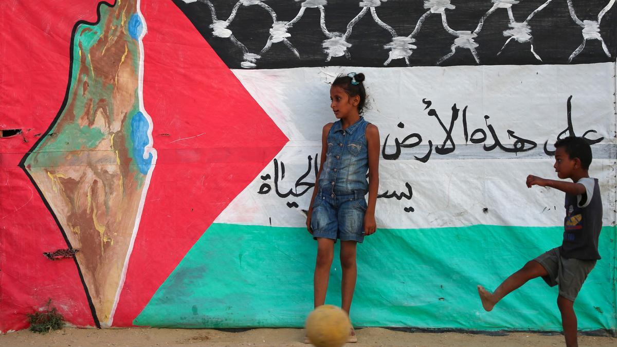 Displaced Palestinian children playing in front of a Palestinian flag at the Bureij camp for refugees in the central Gaza Strip on September 22.
