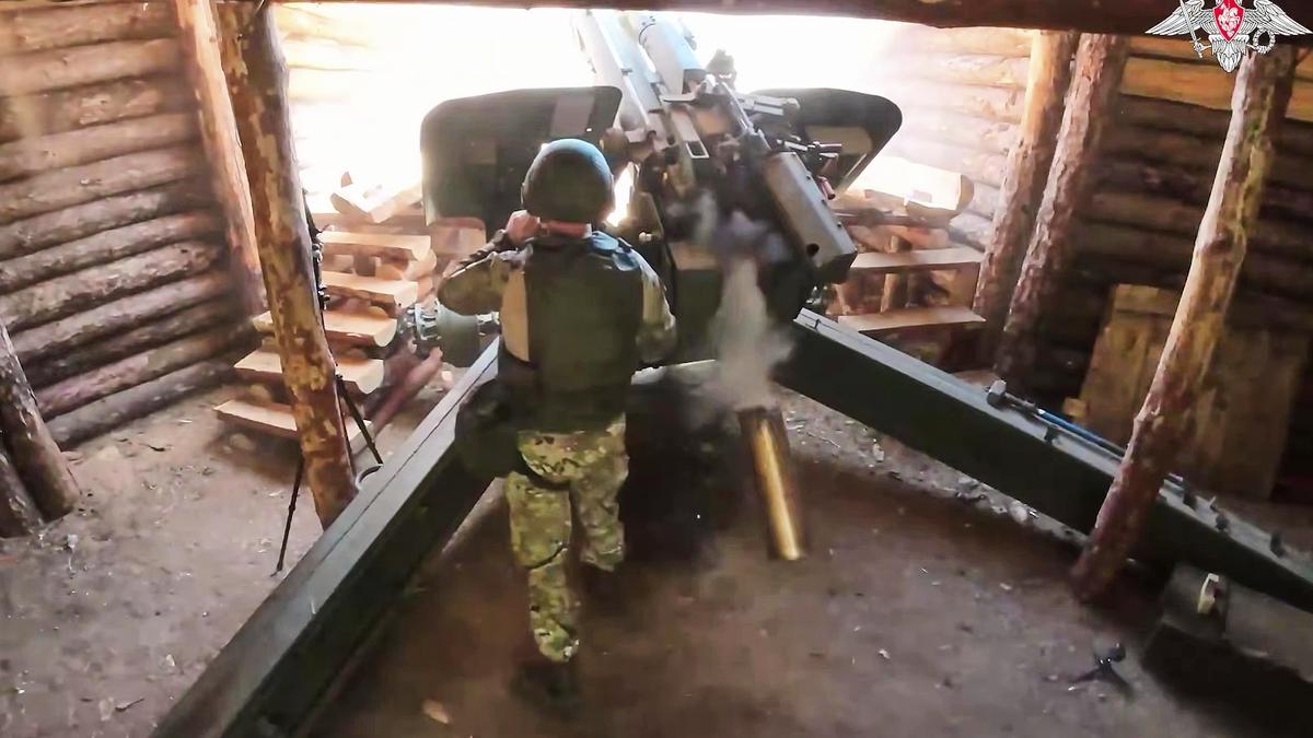 In this photo taken from video distributed by Russian Defence Ministry Press Service on Wednesday, July 16, 2025, a Russian soldier fires a 152 mm howitzer 2A65 Msta-B towards Ukrainian position in an undisclosed location in Ukraine.