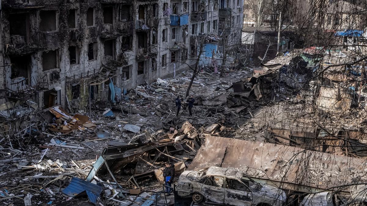 People stand at the site of an apartment building hit by a Russian missile strike, amid Russia’s attack on Ukraine, in the town of Dobropillia, Donetsk region, Ukraine March 8, 2025