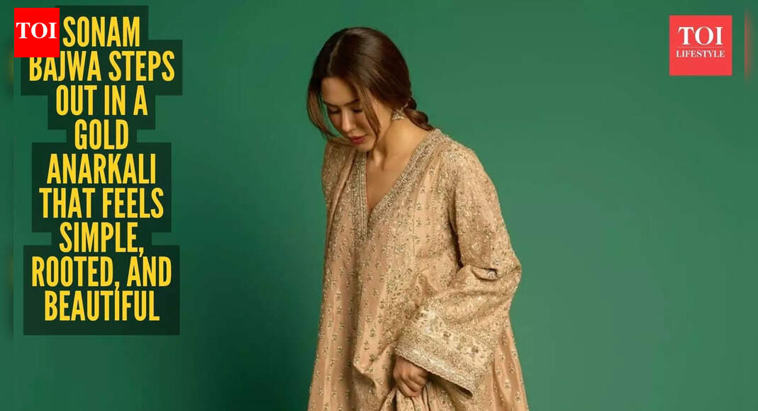 The purple potli is a sweet little surprise. Just a pop of colour to break the gold, without stealing attention from the suit. Small detail, but it adds personality. Her makeup and hair stick to the same relaxed vibe. Fresh skin, soft makeup, nothing heavy or sharp. Hair pulled back casually, with a few loose strands around the face. It feels natural, like she didn’t try too hard, and that’s what makes it work. What really stands out, though, is how comfortable she looks. Calm, confident, and completely at ease. That’s Sonam Bajwa’s thing. She doesn’t wear suits like they’re outfits. She wears them like they’re part of her. And this gold-toned anarkali feels exactly like that. Simple, rooted, and quietly lovely.