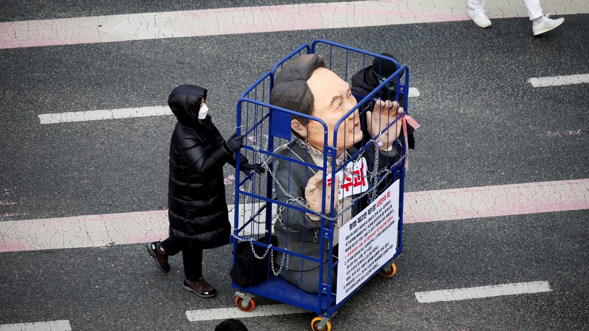 A person pushes an effigy in a cage during a rally calling for the impeachment of South Korean President Yoon Suk Yeol, who declared martial law, which was reversed hours later, in Seoul, South Korea, December 12, 2024.