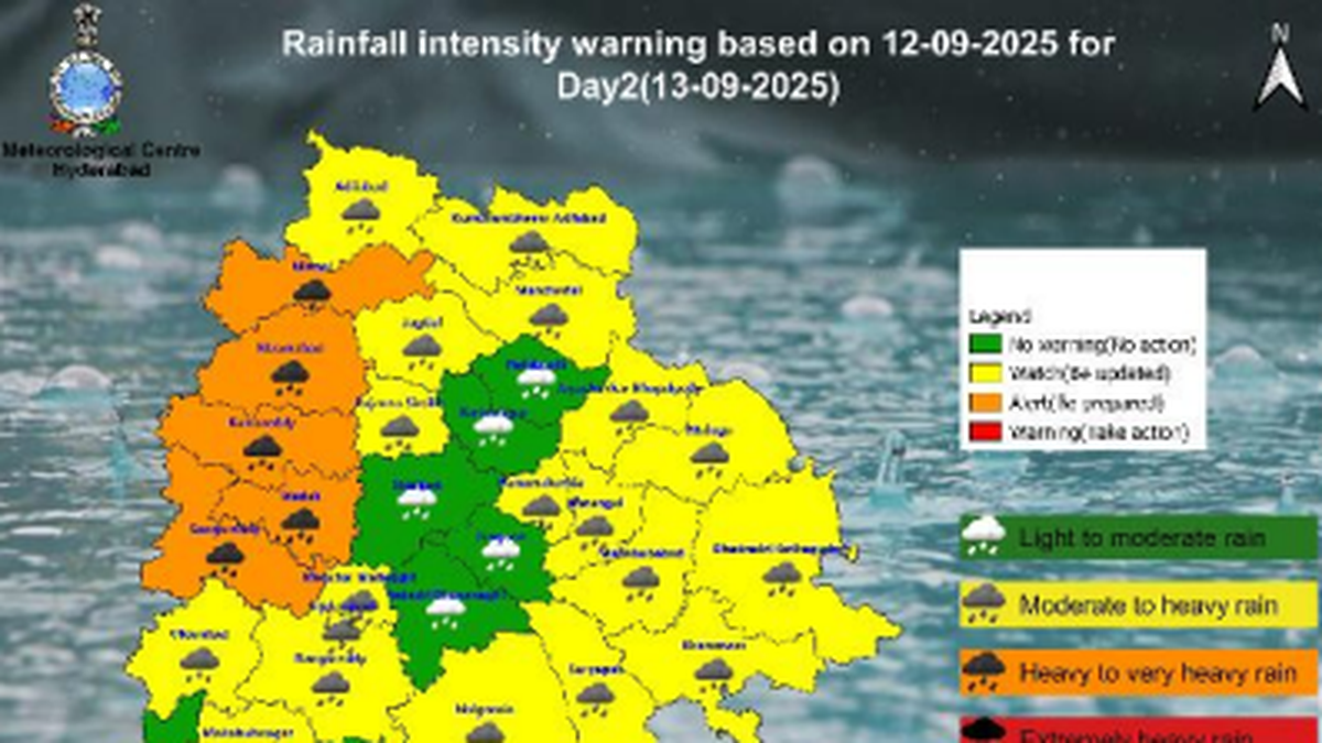 An orange alert was issued for five districts in Telangana for Saturday (September 13, 2025)
