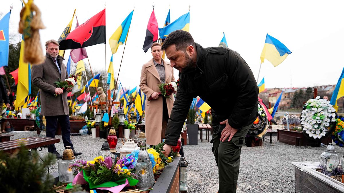 Ukraine’s President Volodymyr Zelensky (R), Denmark’s Prime Minister Mette Frederiksen (C) and her husband Bo Tengberg (L) attend a memorial ceremony at the Field of Mars of Lychakiv Cemetery in Lviv on February 23, 2024 amid the Russian invasion of Ukraine.