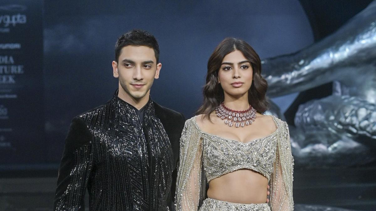 Actors Khushi Kapoor and Vedang Raina walk the ramp for fashion designer Gaurav Gupta at India Couture Week, in New Delhi, Monday, July 29, 2024