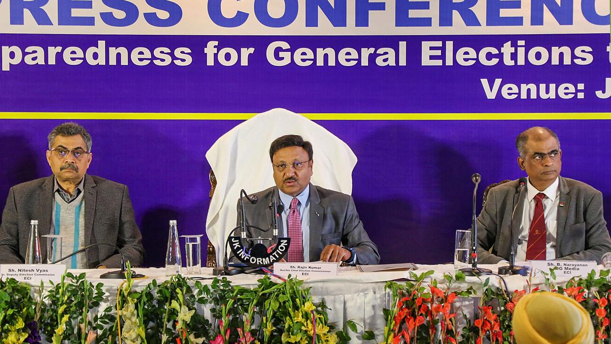 Chief Election Commissioner Rajiv Kumar addresses a press conference on poll preparedness in Jammu on March 13, 2024.